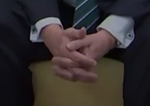 Gazetecilerin tokalaşın talebine karşı Trump, başıyla bu isteği reddederken, aynı anda elleri birbirine kenetleniyor. Ellerin birbirine kenetlenmesi bir iç gerginlik belirtisidir. Trump, tokalaşmayacağını öncesinde planlayarak gelmiş görünüyor. Bu hesaplı düşünce Trump’ta stress yaratmış. Dolayısıyla stress seviyesinin yükselmesiyle ellerini kenetliyor.